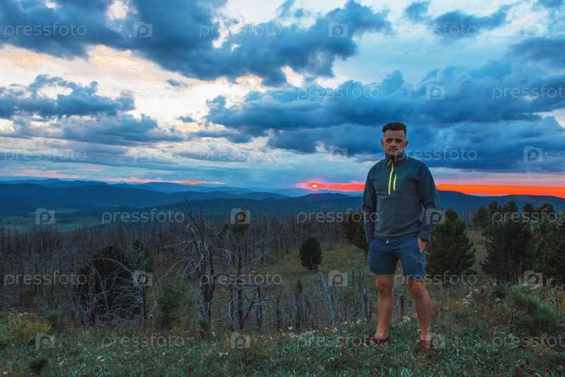 Концепция путешествия, свободы и туризма - человек стоит на вершине скалы в летний прекрасный вечер в горах Алтая