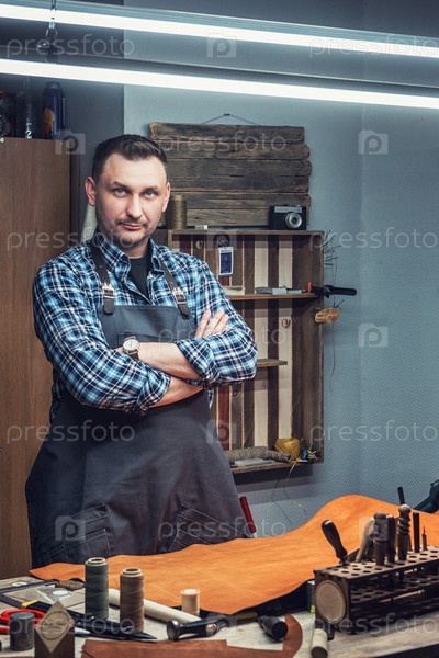Мужчина, работающий с кожаным текстилем в мастерской.Портрет мужчины.Концепция ручного ремесленного производства изделий из кожи