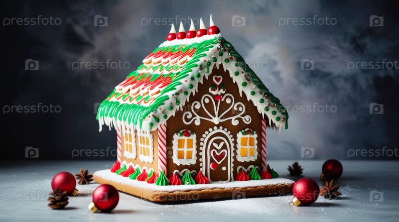 Празднично украшенный пряничный домик, украшенный разноцветной глазурью и сладостями