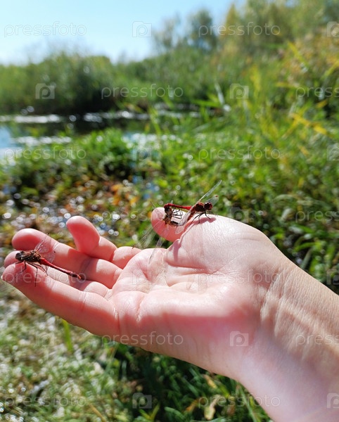 Стрекозы удивительные, впечатляющие спариваются на руке у реки! самец ждет очереди.Одоната