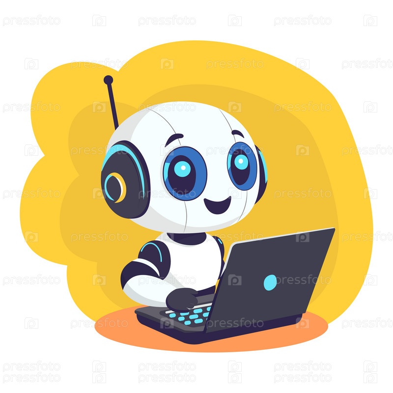 Дружелюбный робот со счастливым лицом и большими сверкающими глазами работает на ноутбуке