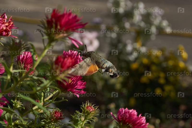 Макроглосс (лат. Macroglossum stellatarum) собирает нектар из цветов Осень, октябрь 2024 г