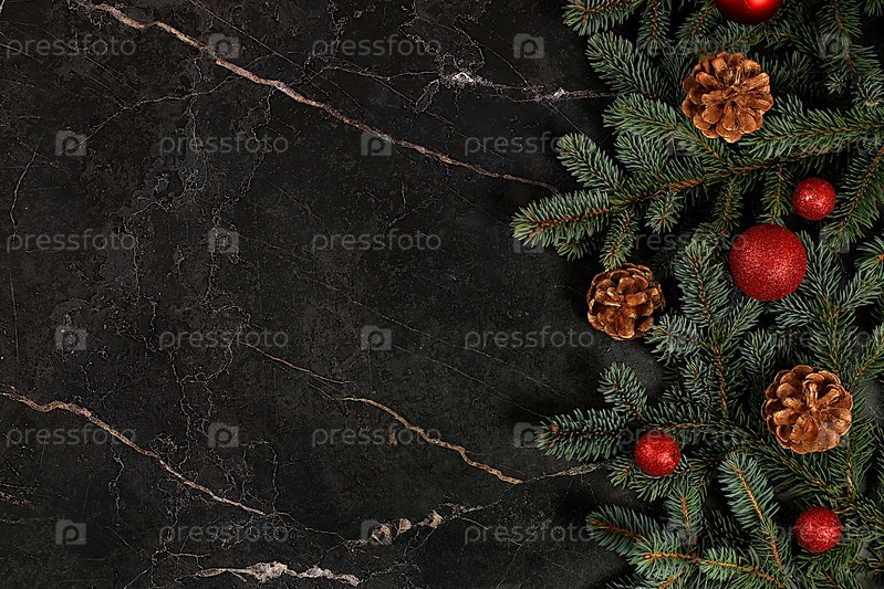 Рождественская и новогодняя композиция 2025 года, фон с синими еловыми ветками с праздничными украшениями на темном столе, баннер для праздничного экрана, шаблон для дизайна. Праздничная открытка,