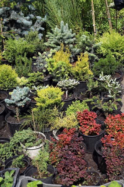 Зеленые хвойные деревья и барбарис с красной листвой продаются в пластиковых контейнерах