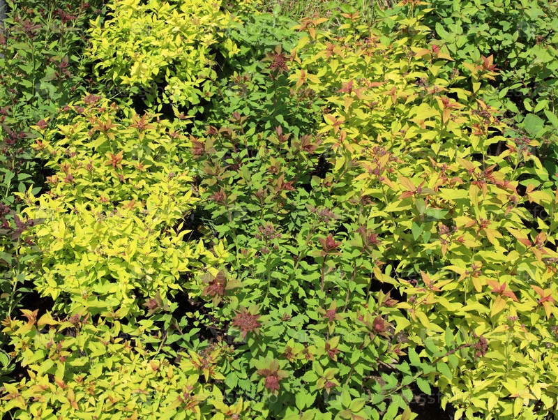 Молодые кусты спиреи с желтыми и зелеными листьями набирают цвет