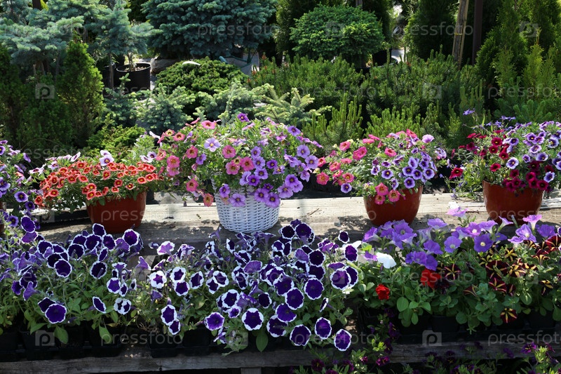 Цветущие петунии разных цветов в горшках на фоне хвойных деревьев