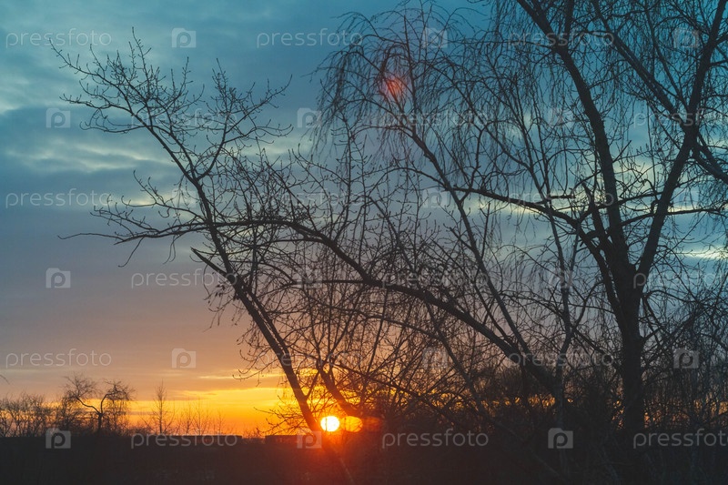 Прекрасный утренний рассвет весной. Фантастический рассвет весеннего солнца. Красные оттенки и черные силуэты деревьев