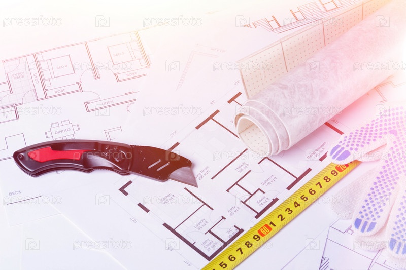 План здания. Инструменты для укладки линолеума и напольных покрытий. Ремонт в доме