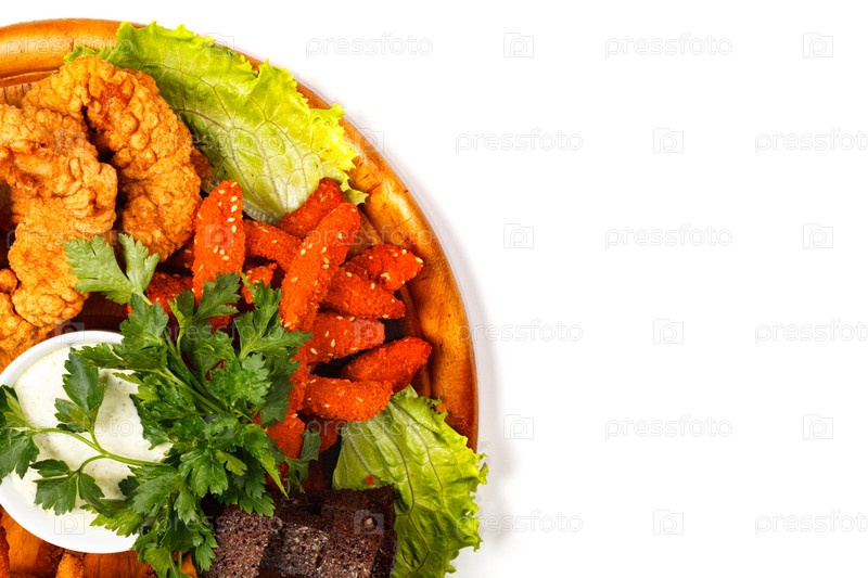 Крупным планом снимок подноса с едой, полного вкусных закусок, изолированного на белом фоне. Плоская планировка