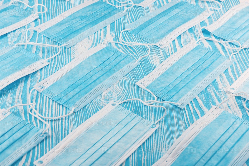 Медицинские маски на синем фоне для защиты от коронавируса. Концепция эпидемии и здравоохранения, узор, плоская планировка