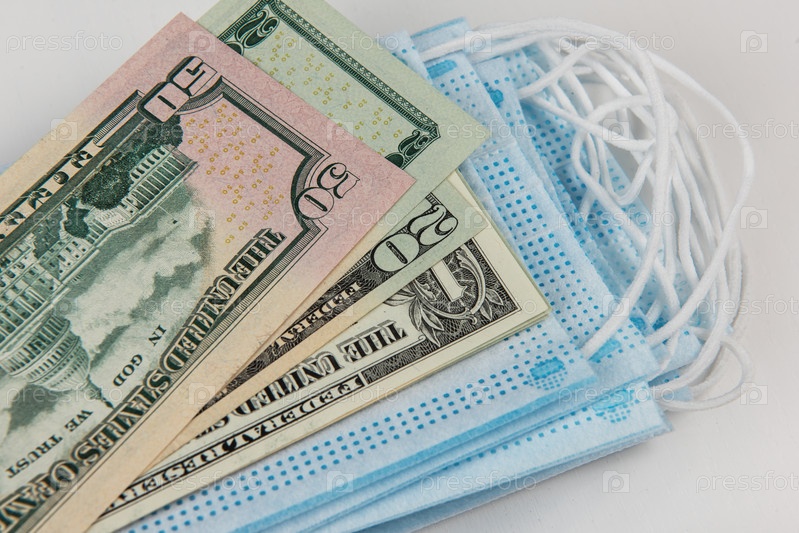 Продать - купить концепцию медицинской маски для лица. Защитные маски для лица и банкноты долларов США