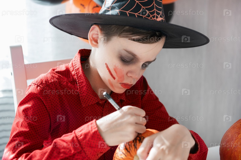 Мальчик-подросток в костюме готовится к празднованию Хэллоуина, рисуя тыкву. Концепция карнавала или маскарада на Хэллоуин