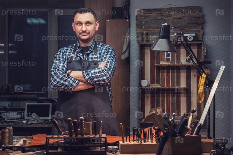 Мужчина, работающий с кожаным текстилем в мастерской.Портрет мужчины.Концепция ручного ремесленного производства изделий из кожи