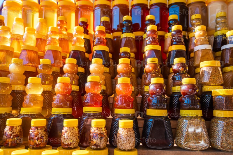 Много банок со свежим органическим медом на фермерском рынке. Цветной мед с фруктами, ягодами и орехами в банке, на рынке на Алтае