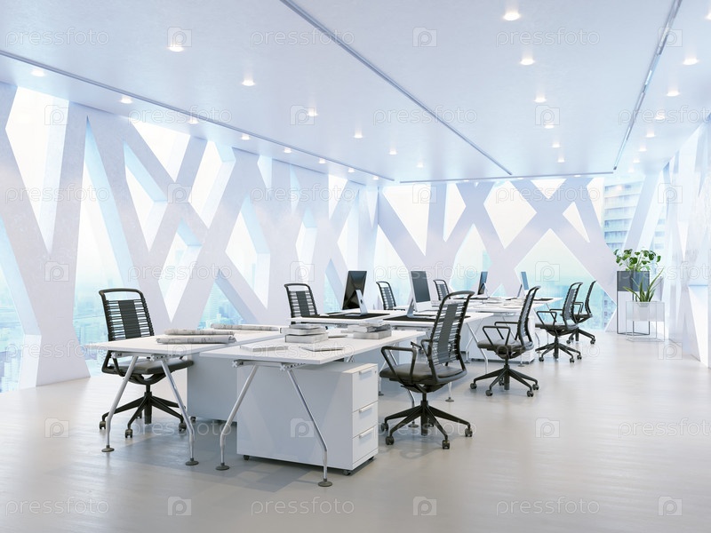 Футуристический офис с геометрическим окном. 3D-рендеринг