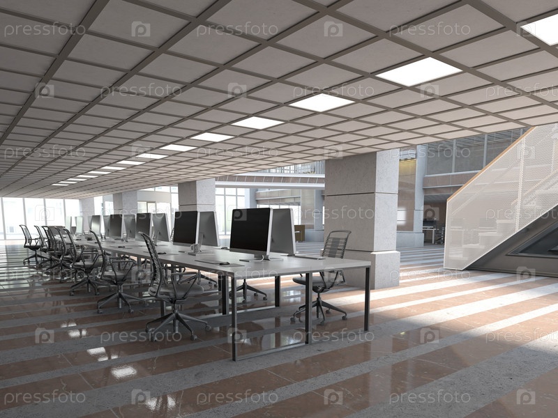 Современное офисное пространство открытой планировки, залитое естественным светом с использованием стекла, металла и чистого минималистического дизайна. 3D-рендеринг