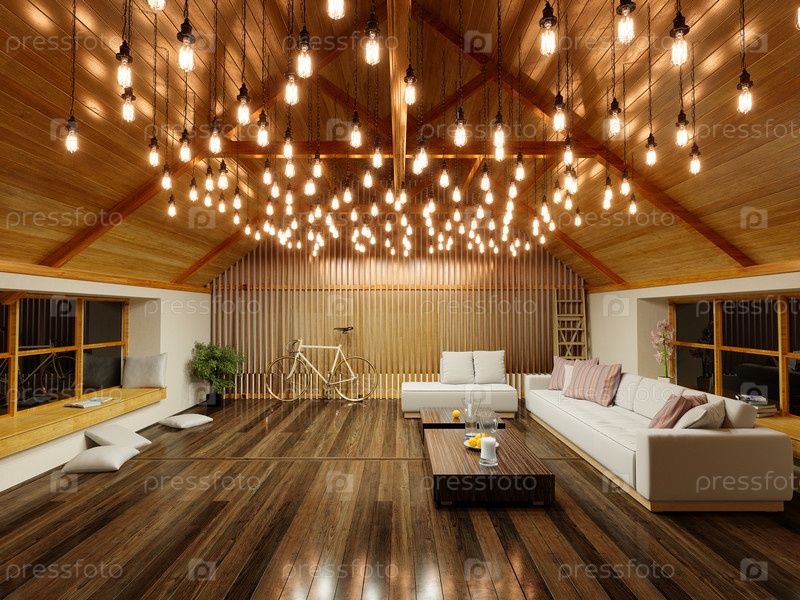 Теплая уютная комната с деревянным потолком и современным дизайном освещения. 3D-рендеринг