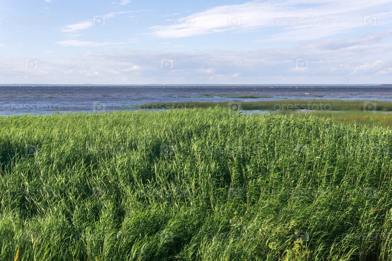 Морской пейзаж, побережье Балтийского моря с тростниковыми зарослями на переднем плане