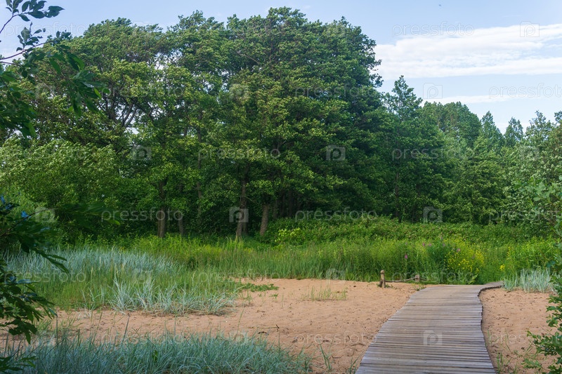 Деревянный настил на прибрежной природной тропе среди песчаных дюн
