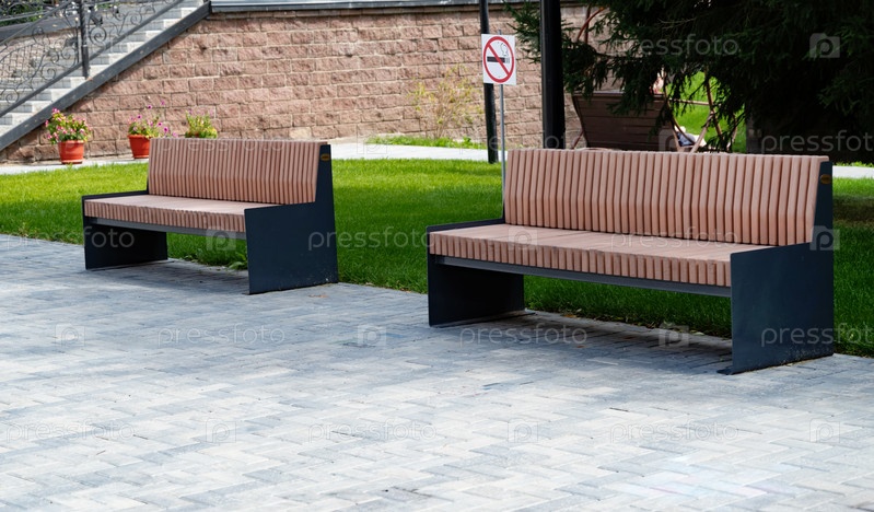 Изображение современных деревянных скамеек с черными металлическими рамами в парке. Зеленая трава и знак «не курить» на заднем плане. Концепция городских парковых сидений