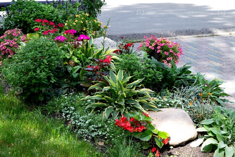Яркая клумба с разнообразными красочными цветами и пышными зелеными растениями на садовой дорожке, представляющая концепцию процветающего сада