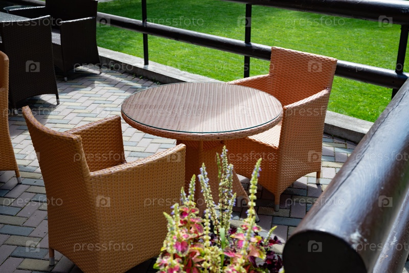 Комплект плетеной садовой мебели со столом у ручья в пышном саду