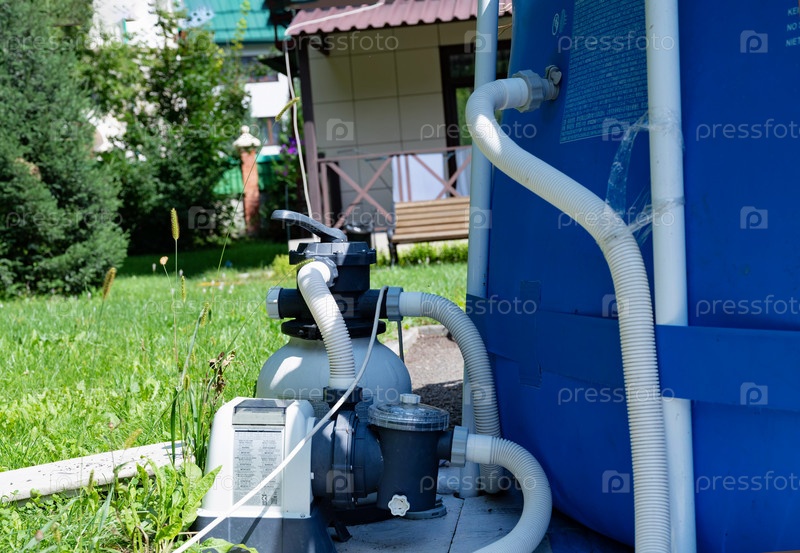 Крупный план системы фильтрации бассейна, подключенной к надземному бассейну в саду на заднем дворе, с зеленой травой и растениями на переднем плане, подчеркивающий концепцию ухода за бассейном и жизни на открытом воздухе