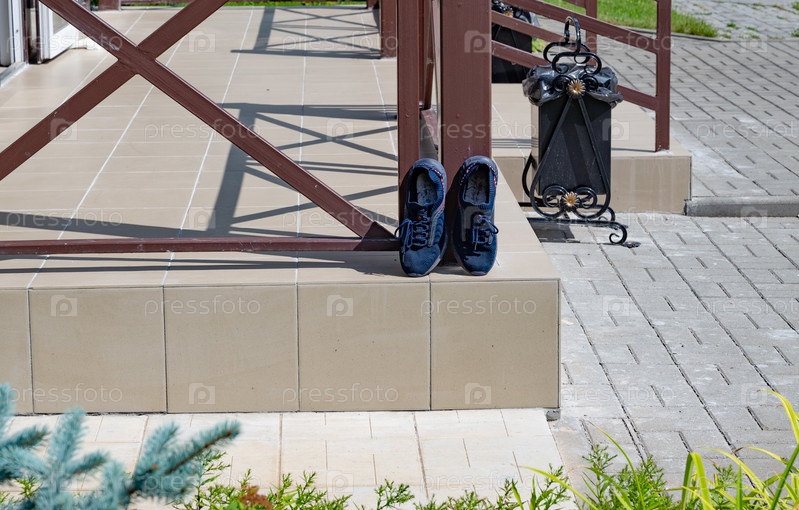 Пара синих кроссовок, прислоненных к коричневой колонне на кафельном полу, сохнет на солнце