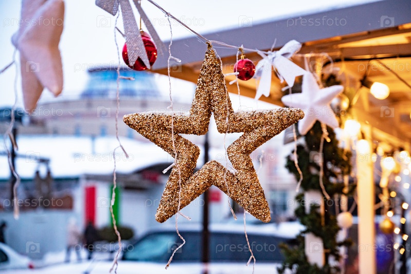 Стильная рождественская золотая звездная иллюминация и еловые ветки с красными и золотыми шарами, золотистые огни боке на фасаде здания на праздничном рынке на городской улице. Рождественский уличный декор