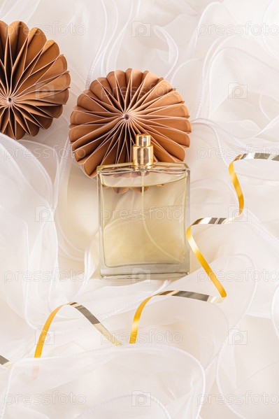 Элегантный флакон духов на бежевом шелковом фоне с коричневыми бумажными эко-игрушками и золотым серпантином. Новогодние духи