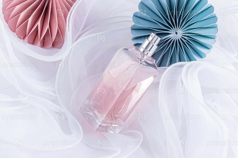 Тонкий флакончик косметического спрея или духов на белом волнистом фоне шелковой ткани с новогодними бумажными игрушками. вид сверху. Концепция праздника