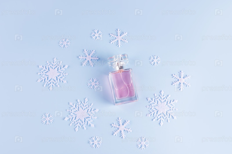 Хрустальный флакон женских духов на нежном синем фоне с белыми снежинками. Концепция праздничного парфюма, подарка. вид сверху. макет
