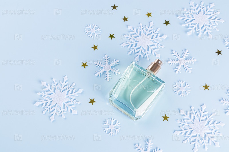 Флакон духов без бренда на синем фоне среди декоративных снежинок и золотых звезд. вид сверху. Копировальное пространство. пустой макет флакона. шаблон