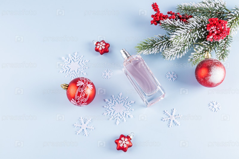 Флакон духов без бренда на синем фоне среди декоративных снежинок и золотых звезд. вид сверху. Копировальное пространство. пустой макет флакона. шаблон
