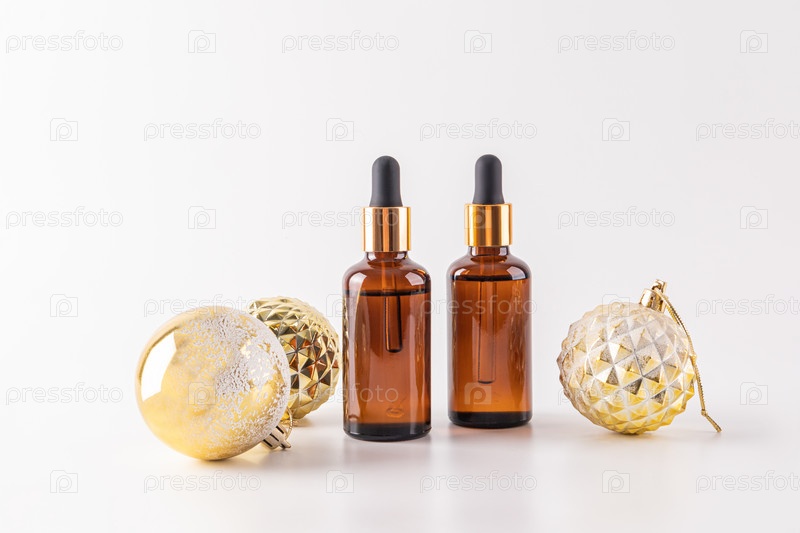 Две шикарные косметические бутылки с натуральным средством по уходу за лицом и телом на белом фоне с золотыми шариками. Вид спереди. Новогодняя косметическая концепция