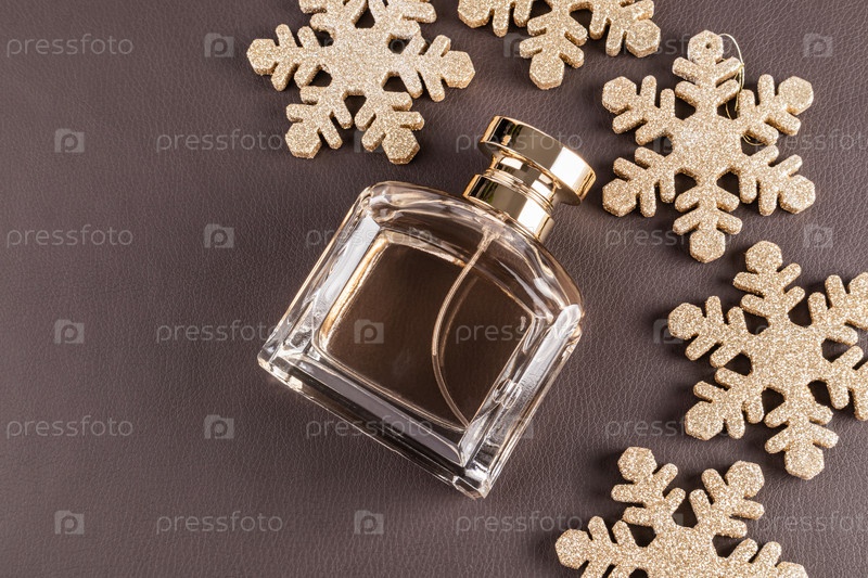 Шикарный флакон духов с золотым колпачком на коричневой коже с рождественскими золотыми снежинками. Пустой макет небрендового флакона. вид сверху