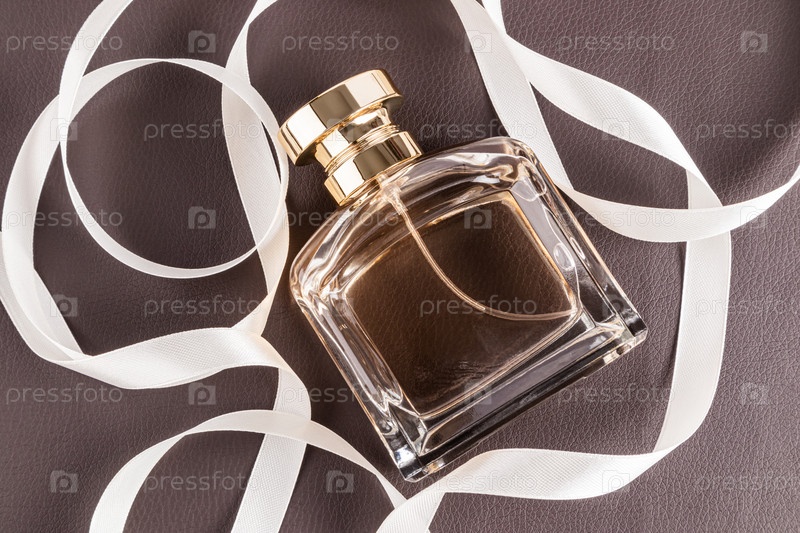 Шикарный флакон дорогих духов с кожаным ароматом на фоне коричневой кожи среди кремовой атласной ленты. вид сверху. Пустой макет флакона. шаблон