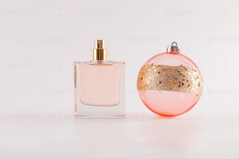Красивый флакон духов на белом фоне с шикарным новогодним большим шаром со стразами. Вид спереди. Пустой макет флакона. презентация