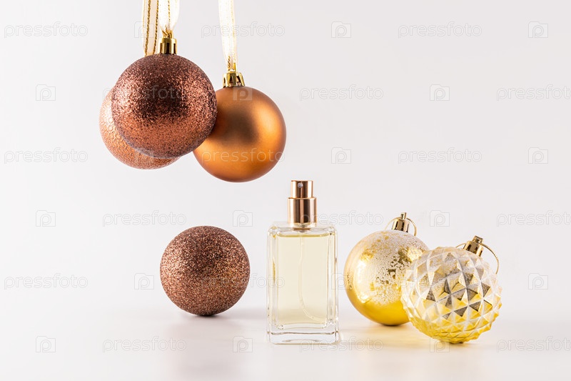 Элегантный флакончик спрея, духов на белом фоне среди коричневых и золотых елочных шаров. Презентация новогоднего продукта. Вид спереди