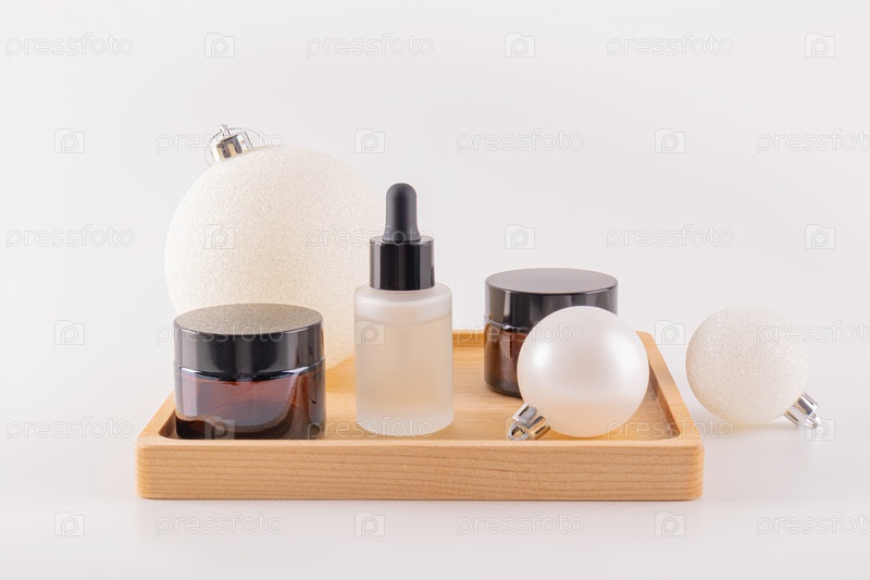 Набор натуральных косметических средств. Увлажняющий органический крем, сыворотка для лица во флаконе-капельнице на деревянном подносе с новогодними белыми шариками