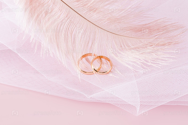 Пара золотых обручальных колец лежит на нежном воздушном декоративном пере и белой фате невесты. розовый фон. Место для копирования. открытка
