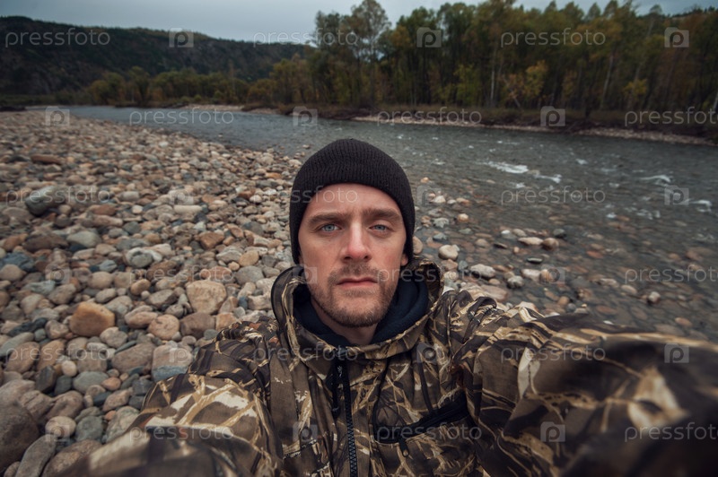 Белый мужчина в горах делает селфи