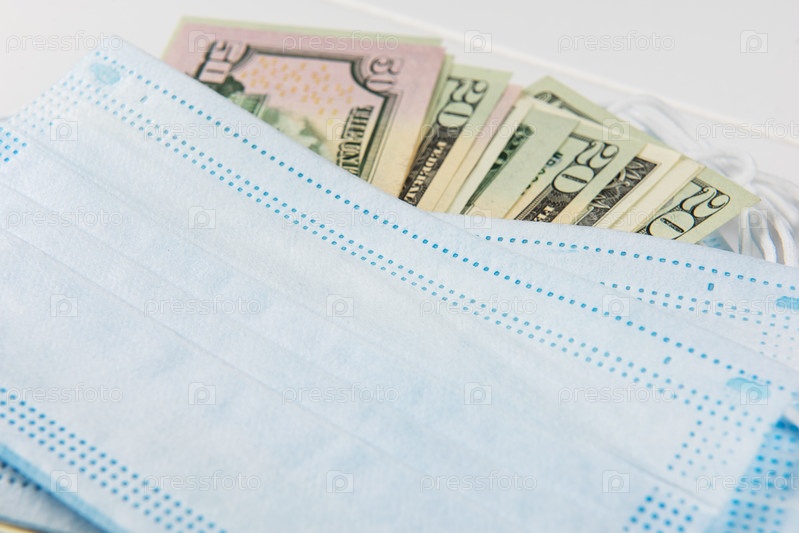 Продать - купить концепцию медицинской маски для лица. Защитные маски для лица и банкноты долларов США