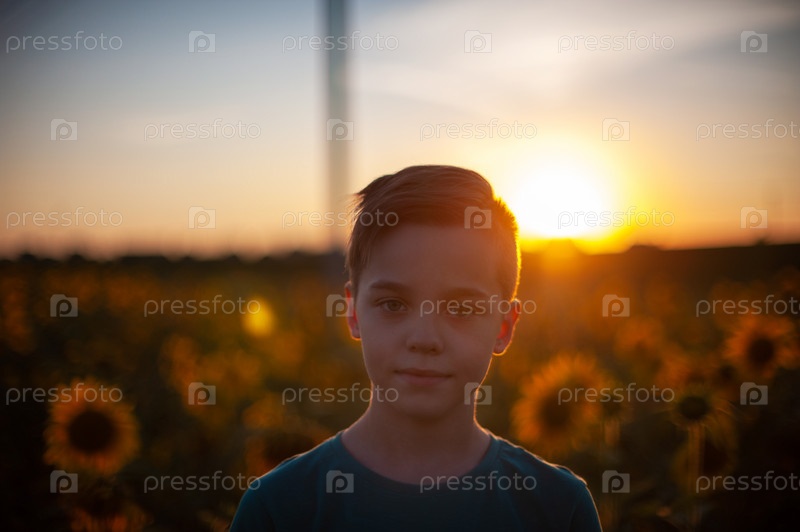 Портрет красивого светловолосого мальчика на летнем поле подсолнечников на открытом воздухе. Милый школьник веселится теплым летним вечером на закате