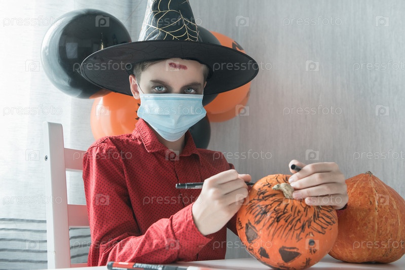 Мальчик-подросток в костюме готовится к празднованию Хэллоуина, рисуя тыкву. Карнавал на Хеллоуин с новой реальностью и концепцией пандемии. Дети в масках для защиты от COVID-19