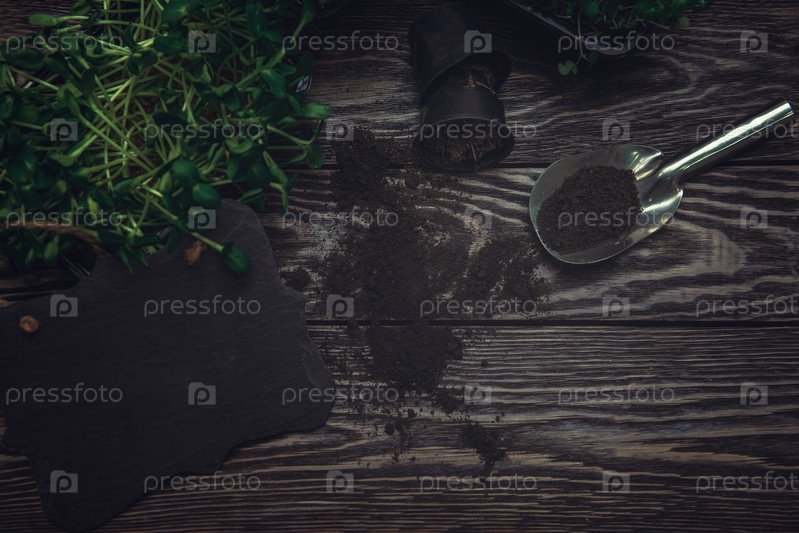 Микрозелень, растущая в горшках на деревенском деревянном фоне