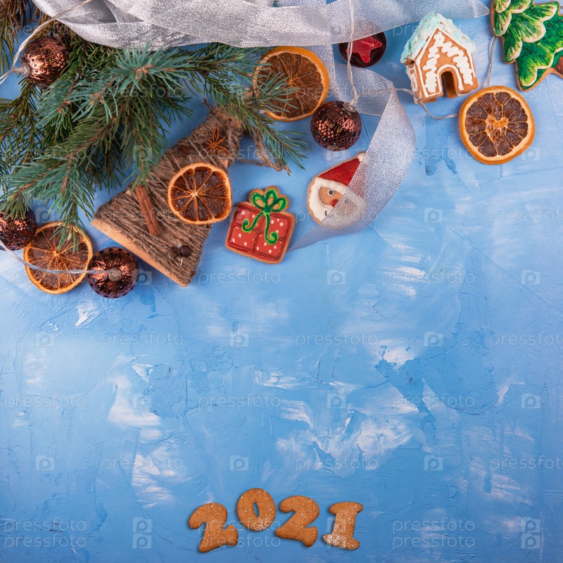 Рождественский праздник синий бетонный фон с еловыми ветками, гирляндами игрушек и украшениями. Тема Рождества и Нового года. Плоская планировка, вид сверху, место для текста