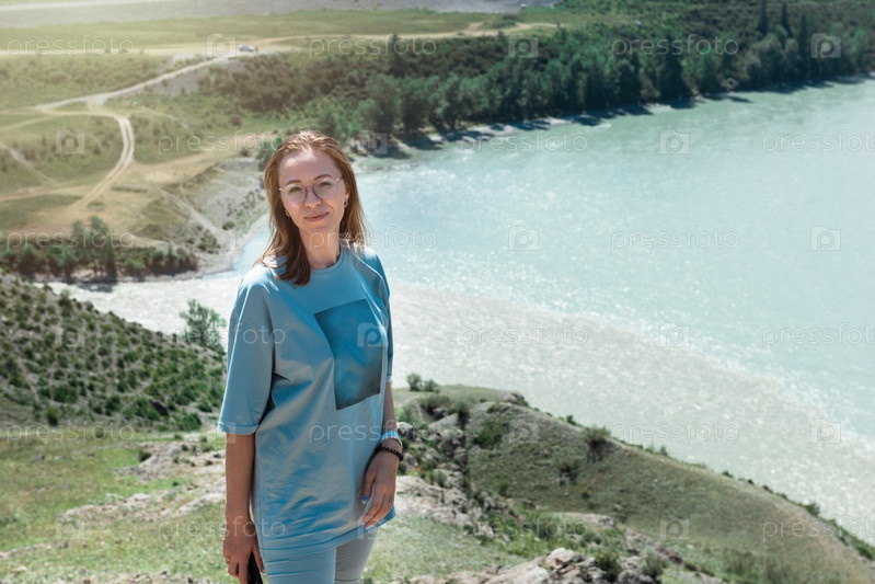 Женщина на месте слияния двух рек Катуни и Чуи в горах Алтая, красота летнего дня, туризм, путешествия, отдых и концепция свободы