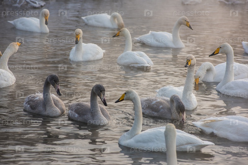 Группа красивых белых лебедей-кликунов, плавающих в незамерзающем зимнем озере. Возрастные птицы с их молодым выводком, концепция семьи