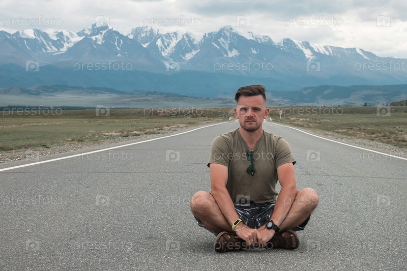 Красивый молодой кавказский мужчина сидит на дороге в горах Алтая